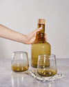 This handmade decanter/bottle is crafted from recycled glass diverted from landfills. Artisans crush and melt down broken, discarded glass, then hand-blow the molten fragments into a beautiful amber glass decanter for wine or liquor. This sustainable process not only creates stunning pieces but also supports environmental protection and community revitalization.