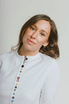 A playful twist on a timeless silhouette. Handcrafted from soft stretch cotton, this fitted tee features a row of one-of-a-kind vintage buttons — each carefully chosen and no two the same. The sculpted neckline, long sleeves, and front slit hem bring subtle structure, while the eclectic buttons add a touch of story and soul.