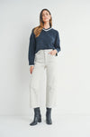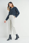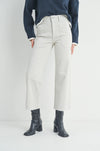 Your favorite fit, now in a beautiful sea salt off-white/grey. High rise and perfectly fitted at the hips. Features a utility cargo front pocket and cropped, raw hem "nautical" wide leg. We love the big, roomy pockets that fit your phone and add just the right amount of drama.