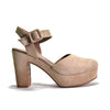 Closed-toe sandal with quarter strap on wrapped heel. Lightly padded leather footbed. Leather lining. Rubber sole. All of the comfort you need in a heel!