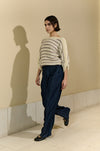 Boat neck sweater with seamless raglan sleeves. Knitted in textured stitch with contrasting burgundy wine red striping, blending a cotton yarn with a polyamide yarn that provides a soft fuzzy effect. Featuring a 100% cotton ribbed band that contrasts with the textured stitch and highlights the sleeves with wide rounded cuffs and the boat neckline. Made in Portugal in gauge 3. The yarn used comes from Italy. A future heirloom.
